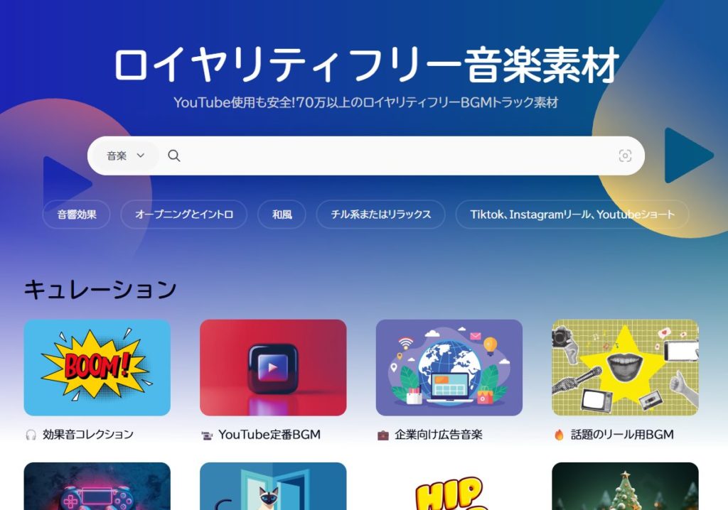 ポップ、ジャズ、ロック、EDM、アンビエントなど幅広い音楽ジャンルをカバーし、ロイヤリティフリー音楽素材として商用利用も可能です。