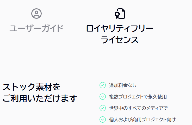 最大の特徴はロイヤリティフリー素材であること。購入またはダウンロード後は、追加料金なしで何度でも利用可能です。しかも商用利用OKで、クレジット表記も不要。