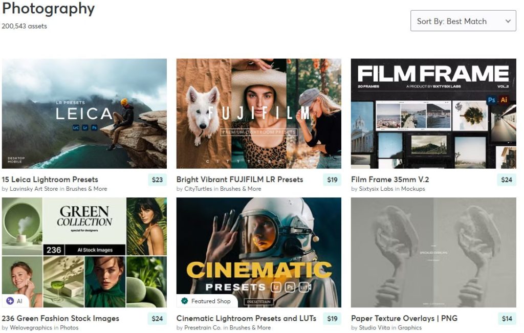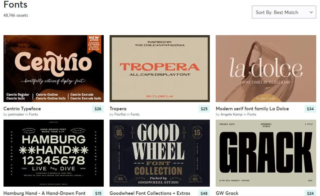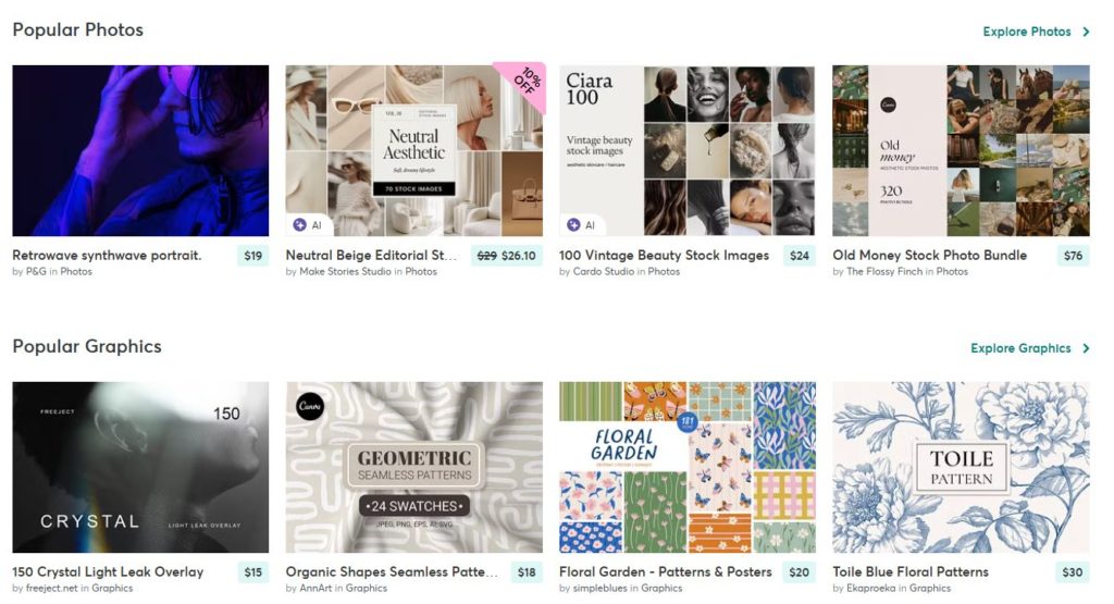 Creative Marketは、世界中のクリエイターが作ったデザイン素材を売買できるマーケットプレイスです。フォントやテンプレート、写真などがそろっており、個人・商用問わず使えるものが多いのが特徴です。
